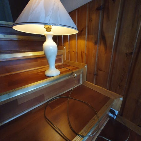 Kul gulvlampe med rød bøttelampeskjerm, trestativ og betongbase. Her får du tak i en lampe ikke alle andre har. Fin farge i bøtte skjermen :)