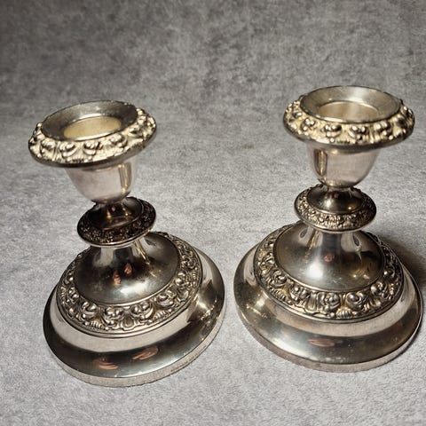 Vintage lysestaker i metall selges for 150kr for paret. Kan hentes i Halden eller sendes mot porto. Lysestakene er 15,5 cm høye.