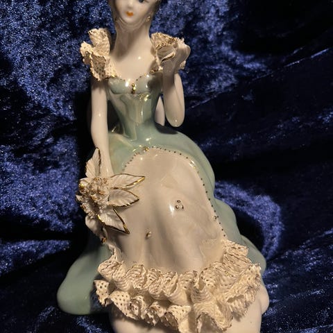Selger en flott, stor porselensfigur av jente med roser, due og ekorn. Flotte detaljer og farger fra den spanske fabrikken San Gar. Med stempel under.
