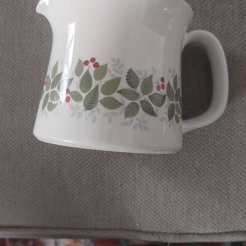 Koselig retro mugge og stor + liten bolle i samme serie. Modellen heter «Brigitte» og er produsert i DDR på 60/70-tallet. Den store bollen har høyde 10 cm, diameter 21,5 cm. Den lille bolken har høyde 6,5, diameter 13,5. Alle deler er i god stand, men små krakelleringer på innsiden av bollene (ikke skjemmende). Selges samlet for 600,-