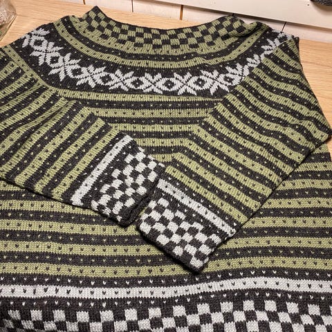 Strikkakjole som dessverre er for stor. Skal være str XL, men den er vel mer M/L. Veldig tøyelig så kan passe mange forskjellige str. Kan trenge en runde med nuppefjerner.