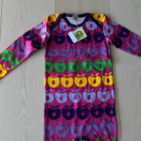 Jeg ser ikke størrelse, men antar at den er str 80/92 sammenlignet med andre plagg. 3 knapper i stroppene slik at den kan reguleres etterhvert som barnet vokser.