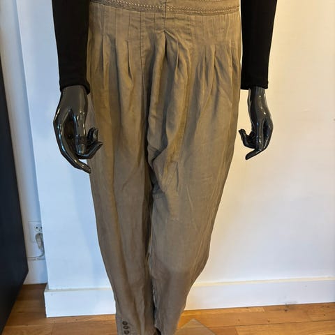 Bukse i offwhite bomull. Strikk i livet og nede på bena. Midje 35x2, lengde 90. Kr 400,-