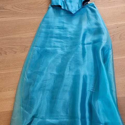 Skjørtet er langt m.underskjørt ,glidelås i siden . Kjolen er ikke brukt.