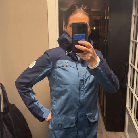 Berghaus vind/regnjakke til dame, str 12 (38/40) selges rimelig. Den er lite brukt, hetten kan tales av og lommene er gode.