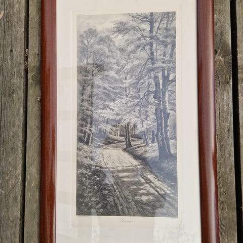 Et flott stemningsfullt maleri med fine fargeoverganger, nå med en matchende sølvramme, selges til oppgitt pris, som er 15% nedsatt. Motivet må være Tanum Kirke i Bærum. Maleriet kan leveres sentralt på Østlandet uten tillegg i pris, eller sendes i posten for kr 129,-. Maleriet er 60 x 70 pluss ramme. Det er på grovt lerret, og malt i 1925.