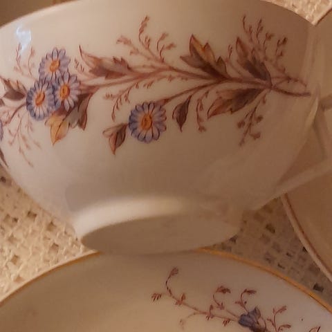 Selger 3 sett meget gamle, fine, hele porselenskopper og fat m dekor, ant Porsgrund Porselen rundt 1900. Nydelig motiv med Margeritter og gullstaffering. Kr 75,- pr sett. Mrk 1265 P under. Hentes i Oslo eller sendes etter avtale.