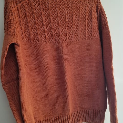 Håndstrikket genser i deilig bomull/bambus. Brukt 1 gang, men ble altfor stor. Størrelse L, kanskje mer XL. Se mål på bilde. Nyvasket. Kan hentes i Treungen eller sendes mot porto. Har vipps