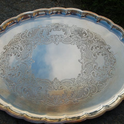 Vakkert gammelt lite brett i sølvplett / stemplet se bilder, 29,5 x 16 cm trenger en puss. Sjekk ut min profil for mye forskjellig. Sender deg gjerne m posten Norge.