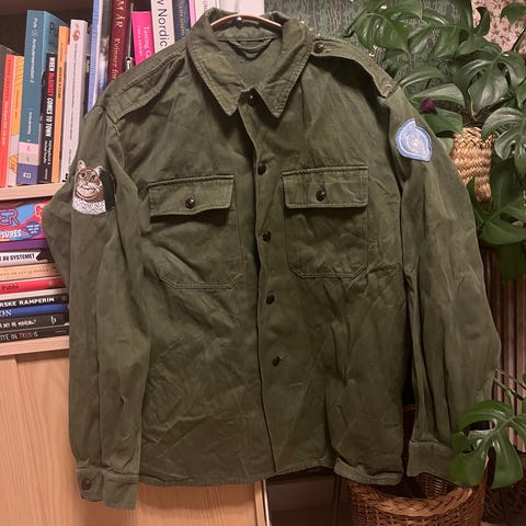 Feltjakkke m/75 kjøpt på Forsvarets auksjon på 90 tallet. Ubrukt jakke i str 4. Selges for kr 350,- pluss porto. Slitesterk og vannavvisende. Forhåndsbetaling via Vipps eller kontonr.