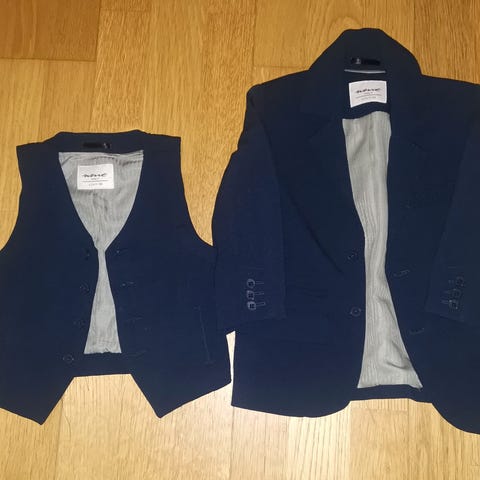 Hvit skjorte med marineblå detaljer og mørkeblå jakke med brune detaljer fra NameIt. Jakken har 10 % ull i seg (60 % bomull og 30 % polyamid). Veldig fint sett. Begge deler i str 86.