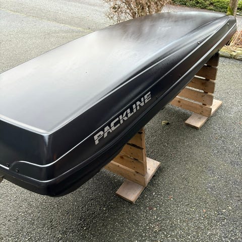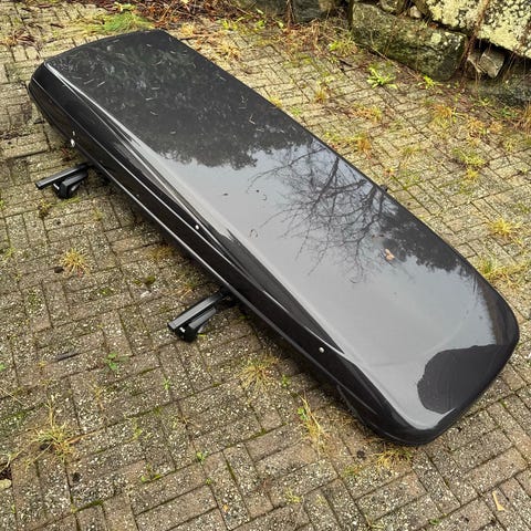 Hel og fin svart takboks fra Packline. Boksen er høyglanspolert Glassfiberarmert, metallforsterket polyester. Er derfor veldig stabil på taket. Bøylene går i kanaler inni boksen, ligger derfor veldig lavt mot biltaket. Lengde 222cm, bredde 90cm og høyde 30cm,( Ca 23cm over bøylene). Rommer hele 460 liter.