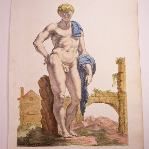 This is a beautiful LARGE FOLIO engraving, hand coloured, of the famous Laocoon figure (sans his two sons), from the 1675 first part of the "Teutsche Academie der Edlen Bau- Bild- und Mahlerey-Künste", published in Nuremberg; the author dedicated it to the “heroes of art and art-lovers” (meaning the artists and art collectors of his day). The book was structured according to the model already used by Giorgio Vasari in his biographies: The theory of the three arts precedes the biographies of the artists. The second part, published in 1679, expands the theoretical works on the genres with extensive antiquarian descriptions. A translation of the Ovid Metamorphoses paraphrase by Karel van Mander was included in this volume. In EXCELLENT condition, with slight foxing around upper and right edges. Some slight spotting on lower margin. Please view images carefully. Joachim von Sandrart (12 May 1606 – 14 October 1688) was a German Baroque art-historian and painter, active in Amsterdam during the Dutch Golden Age. He is best known as an author of books on art, some of them in Latin, and especially for his historical work, the Teutsche Akademie.