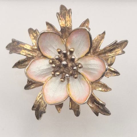 Stor flott Blomster brosje av Hroar Prydz i sølv med hvit emalje. (Emaljeskade)