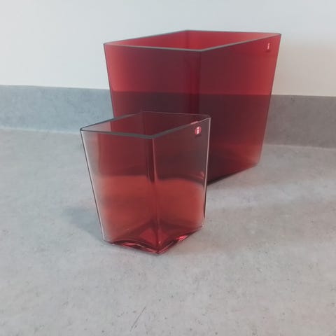 Jeg har for salg tre stk Iittala Ruutu designvaser. De er i sterke rød og blå farger og en i klart glass. Alle tre vasene er av samme størrelse 20.5 x 18 cm.
