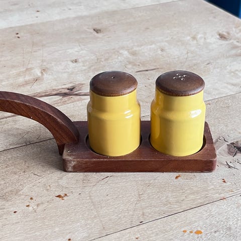 Veldig stilig vintage retro MCM salt og pepper sett i tre selges kr 300,-