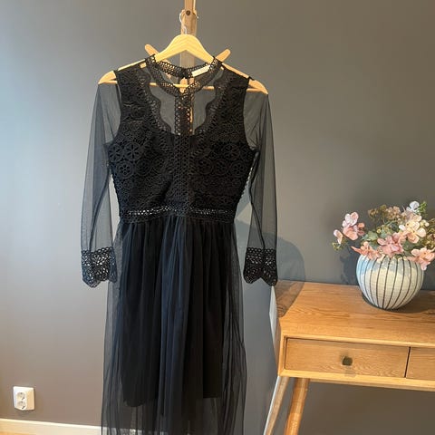 Meget pen, elegant med det svarte/metallisk ytterkjole over beigefarget kjole. Ny kostet den over kr 6000.