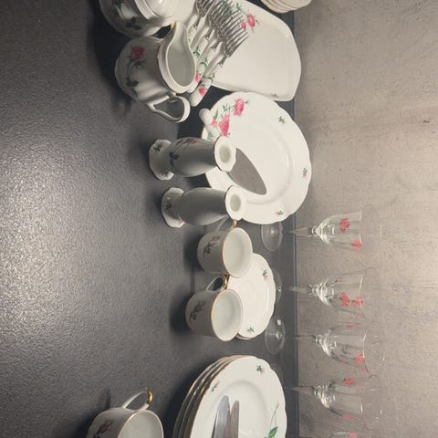 Rose fra Firkløveren 12 likørglass, 11 rødvinsglass, 11 hvitvinsglass, 11 vann/ølglass, 1 vannmugge, 1 karaffel, 1 dessertbolle, 11 dessert skåler. Selges samlet og tar ikke sjansen på å sende, da alt som egentlig var til 12 ble til 11 under flytting. Dette serviset får en ikke tak i lenger. Skambud besvares ikke.