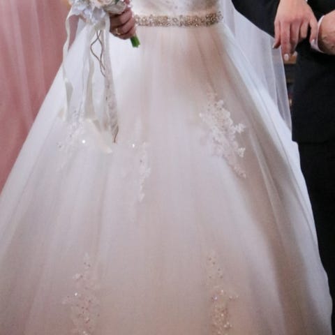 Brudekjole av merket Morilee! Kjøpt ny på brudesalong i Trondheim i 2019. Kjolen er pent oppbevart. Den er ca str 40/42 da den er sydd etter mål! Selges som den er, ikke renset! Noe slitasje i tyllet, men det kan enkelt byttes ut. Det er nok en enkel sak for en syerske å eventuelt bytte ut noe av stoffet.