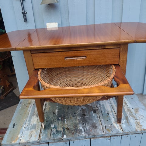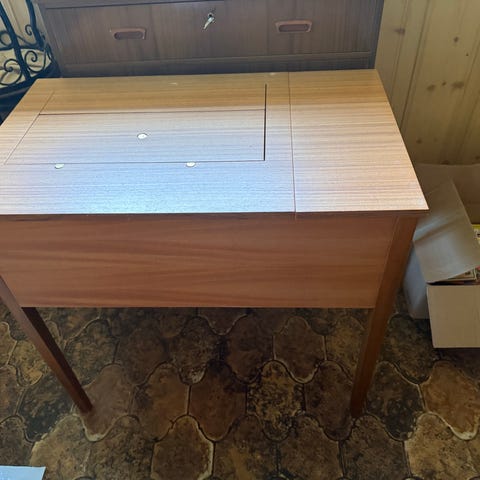 Flott, elektrisk Singer symaskin fra ca 1950. Symaskinen har vakkert bord hvor maskinen ligger nedfelt når den ikke er i bruk. Bordet er pent og kan brukes som avlastningsbord. Maskinen fungerer godt og syr pent. Har vært i bruk inntil nylig.