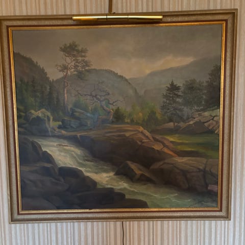 SVERRE NESHEIM 1920 - 1924. MALT OMTRENT I SLUTTEN AV NASJONAL-ROMANTIKKEN 1830 - 1920. PERFEKT STØRRELSE FOR DETTE MOTIV. 110 X 100 CM. MALERIET ER I TOPP STAND OG ER ET BLIKKFANG I ET HVILKETSOMHELST ROM, ENTEN LITE ELLER STORT!