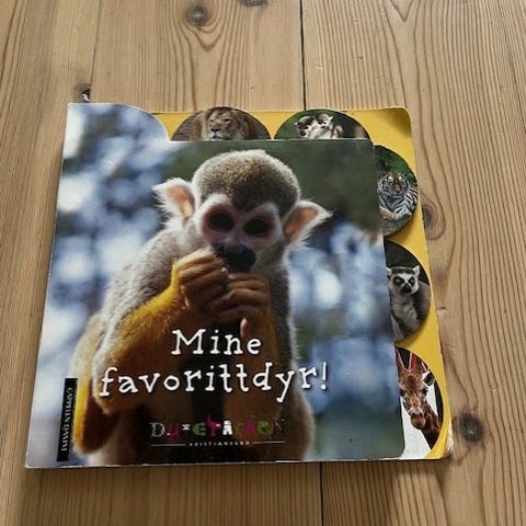 Fin bok på 58 sider. Viser mange dyr med bilde og tekst. Kan nevne: Julius, ekornape, lemur, krokodlile, slange, ulv, jerv, gaupe, oter, sjiraff, sebra, sjøløve, rød panda, kamel, tiger++