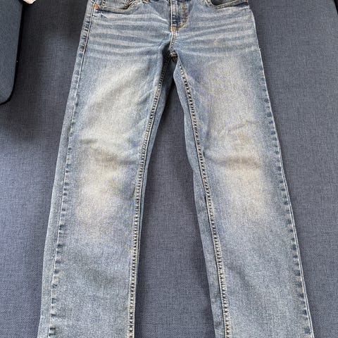 Levis jeans. Kjøpt ny og en del brukt av ett barn. Sydd kneet på for en kul look. Reguleres i midjen med strikk.