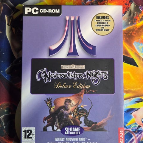 Selger Neverwinter Nights til PC, boks med 3 disker, utfyllende manual, plakat med kart og en quick reference guide.