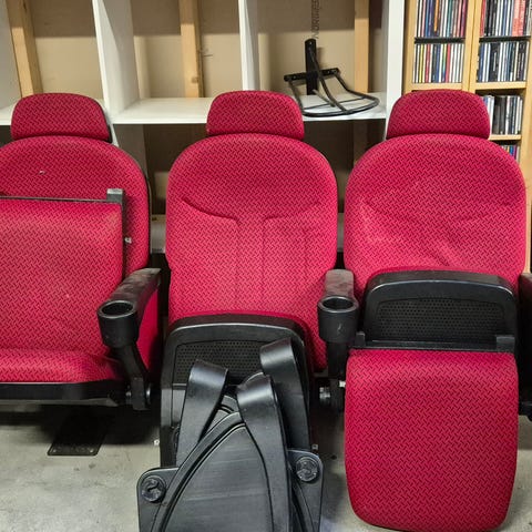 Nydelig 4-seters vintage, kinostolrad fra en gammel kino! Vippestoler. Den står på fraktplanker, som ses på bilde, men kan skrues fast i gulv eller festes på andre måter.
