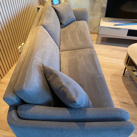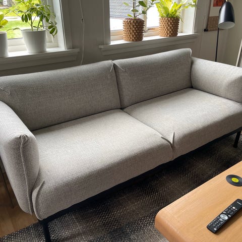 Nb! Denne sofaen er ganske stor, så må kanskje ta av beina under for å få den inn igjennom smale dører! Denne sofaen passer i en stue med mye rom plass, noe som er grunnen til at vi ønsker å selge den!