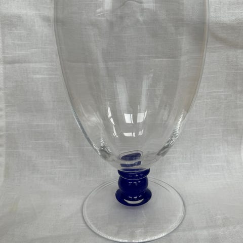 Denne lekre blomstervasen på lav stett med koboltblå spiralpynt ligner veldig på et produkt Firkløveren hadde i sitt sortiment. Siden den ikke er merket selges den som ukjent produsent. Koboltblå spiralpynt. Ø8 cm (oppe). H17,3 cm. Hel og fin. Ingen riper eller nag. Mulig ubrukt.