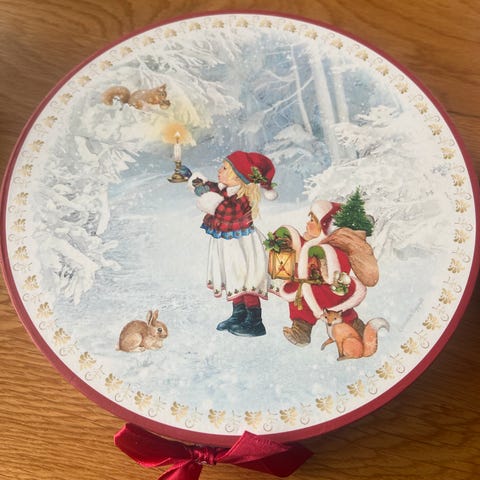 Festlig boks med klassiske julemotiv på lokk. Grei til oppbevaring av dine julekaker.