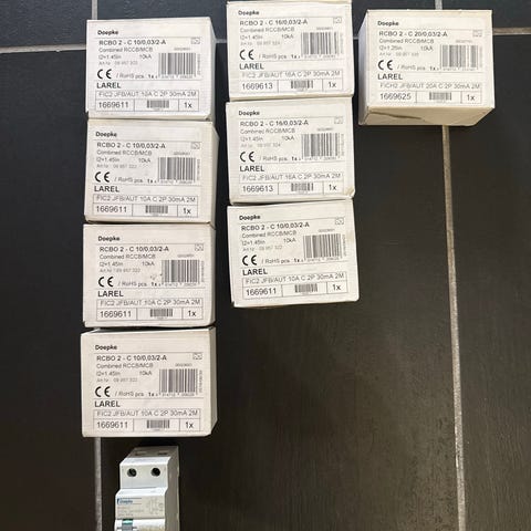 Eaton jordfeilautomater, alt på bildet til salgs. Alt er helt nytt og meste er fortsatt i esker. Garanti inkludert:) ABB, Haager og Schneider også.