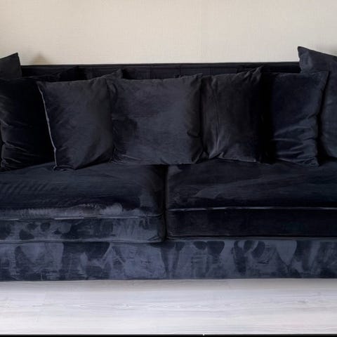 Luksuriøs, lekker sofa i sort velur med vakre sølv detaljer. Svarte ben.