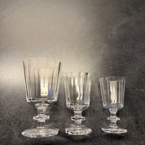 4 glass på stett. De varierer i høyde fra 11,5-12 cm. Diameter varierer også fra 6-6,5 cm. En tumbler, drikkeglass h: 9 cm. d: 6,5 cm. Tilsvarende glass er avbildet i boka «Svenskt glass» av Wahlström og Widstrand mfl. 1999. Der avbildes glass fra Nordiska museét: «fasettslipad servis från 1850- tallet. Kr 200,- pr. Glass eller samlet kr. 800,-. Kan sendes.
