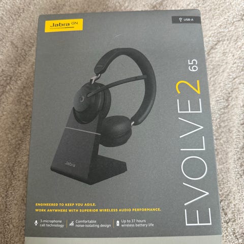 Jabra Evolve2 65 med original eske, etui, USB plugg, USB ledning og docking