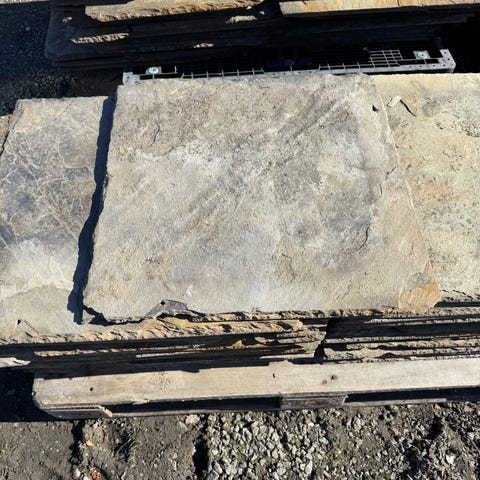 Blanding av Alta- og Oppdal skifer; +\- 50kvm. Varierer i både tykkelse, str og fasong. Platene er stort sett i lys grå overflate.