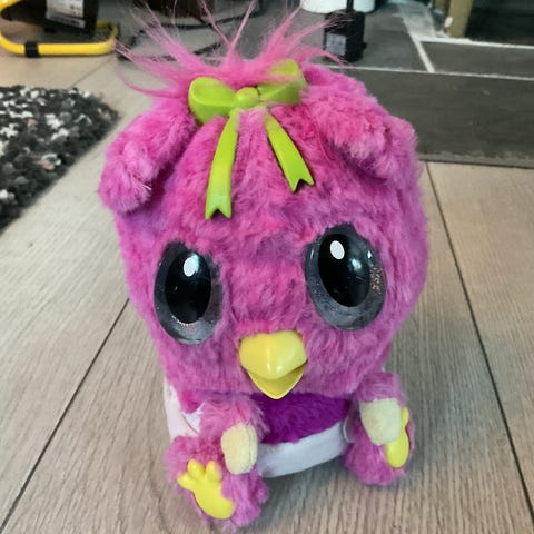 Svært pent og lite brukt Hatchimal-leke, batteridrevet. Når den er påslått lager den (ikke for høye) lyder og skifter til ulike farger på øynene for å uttrykke forskjellige behov. Følger bla med kam og drikkeflaske.