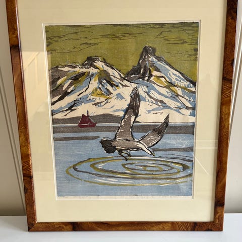 Litografi av Dang Van Ty, «Hjem». Nr. 4 av 60. Selges med ramme, noe ubetydelige småskader på ramme pga. flytting. Men bildet har ikke vært ute av rammen siden det ble rammet inn på galleriet.