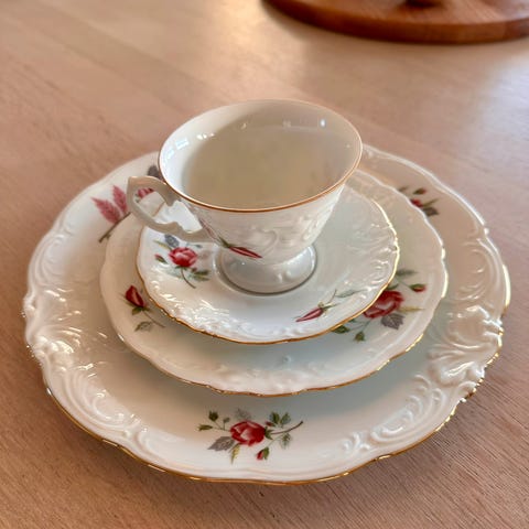 Pent service med kristorn mønster. 6 personer, kopp, skål, asjett. Er helt og fint.