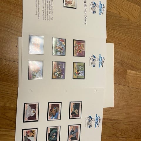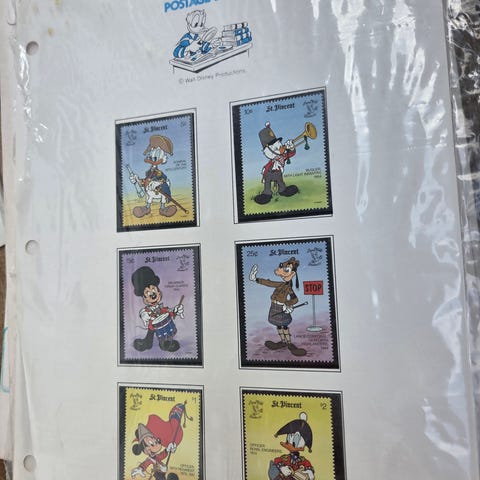 Disney World of Postage Stamps album med samling av frimerker inspirert av Walt Disney og hans karakterer. Albumet inneholder sider med trykte illustrasjoner, og fungerer som et hefte for organisering og visning av frimerker relatert til Disney-tema.