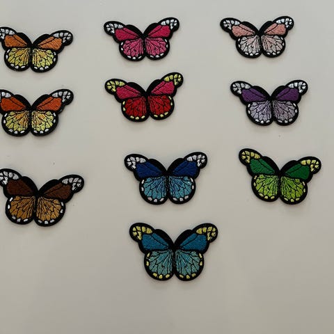 16 forskjellige farger. Disse kan strykes direkte på klær. De kan også vaskes i maskin. De sitter godt. Fine å bruke for å skjule et lite hull el på klær. Eller pynte litt på klær. De måler ca 4 x 7 cm. Pris pr stk 30,- Kan sendes mot porto. Kun forskuddsbetaling ved sending. I