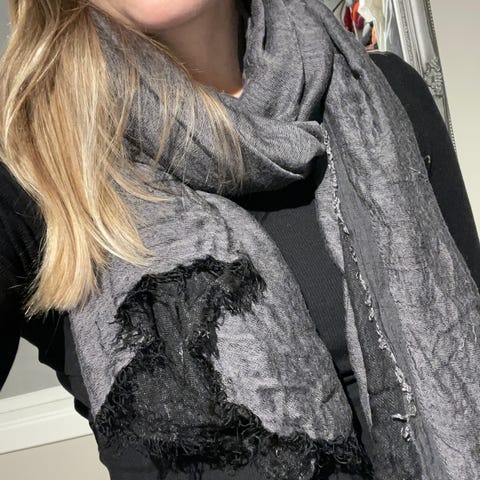 Skjerf laget av nunofilt, en blanding av ull og silke. Ukjent merke. 35 cm bredt. 140 cm langt.