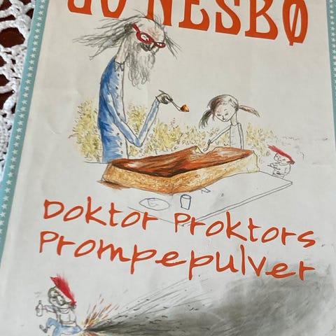 Selger Jo Nesbø sin bok "Doktor Proktors prompepulver". Utgaven er ulest og i hardback.