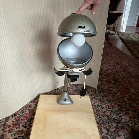 Fremviser fra , 60 tallet antar jeg. Det står Norske Smalfilmapparater AS på. 16 mm. I tillegg lerret og klebepresse (skjøte apparat). Har stått på ubrukt i minst 40 år. Aner ingenting om tilstand. Pris for alt. Bør hentes. Ekstra pærer også.