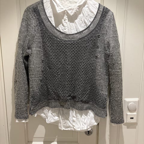 Lite brukt. Ganske stram genser, mtp at den er størrelse L. Burgunder med mørk blå striper.