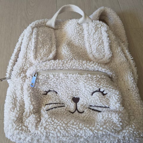 Ryggsekk/skulderveske for jente. En lomme innvendig og en på forsiden, begge med glidelås. En flaskelomme i hver side på randselen. Helt ny. Kr 50,-. Kan sendes.