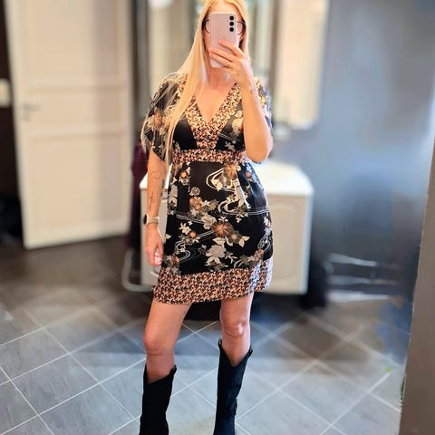 Lengden går cirka litt over kneet og man er 173 cm høy, stretchbelte i livet med gulldetaljer, lommer i siden, trekvart arm, V-utringning. kjolen er ubrukt med tagg. Det er godt med strech i stoffet. Sender gjerne med helt hjem ellers kan den hentes på Bjølsen i Oslo.