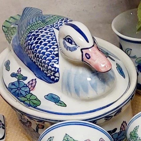 Vakker og enkel terrin med blått mønster. Krukken kan gjemme hemmeligheter, eller ha plass til suppe, lapskaus, fårikål, gryterett eller lignende. Eller hva med desserten?