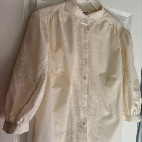 Kortermet grønn bluse med hvitt blomstermønster fra Lotz i størrelse 44-omkrets bryst er 120 cm, lengde 76 cm. Lukkes med knapper i front, ekstra knapp medfølger. Skulderputer som enkelt kan fjernes. Pent brukt uten flekker eller skader.